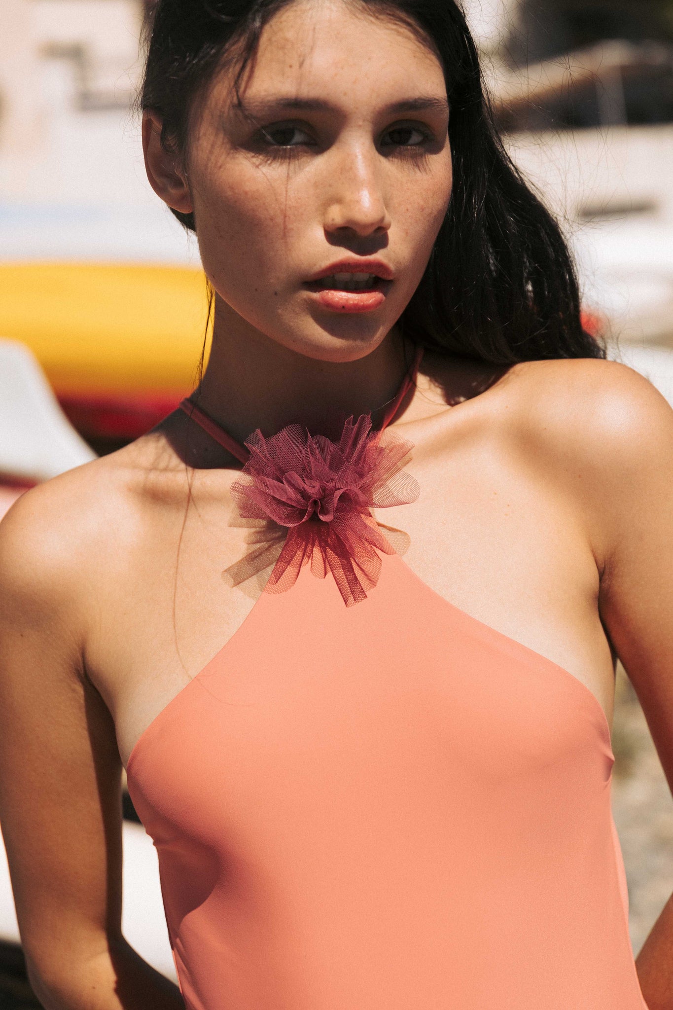 - Halter neckline with criss-cross back ties that let you adjust the fit. Pull it higher and tighten for more coverage.